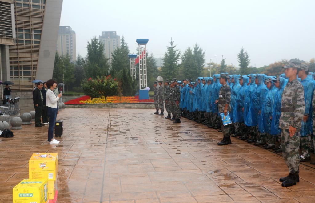 9月18日,294俄罗斯专享会党委副书记李明芳一行看望慰问了冒雨坚持训练的教官及学生,辅导员组长杨小斐老师主持慰问活动。